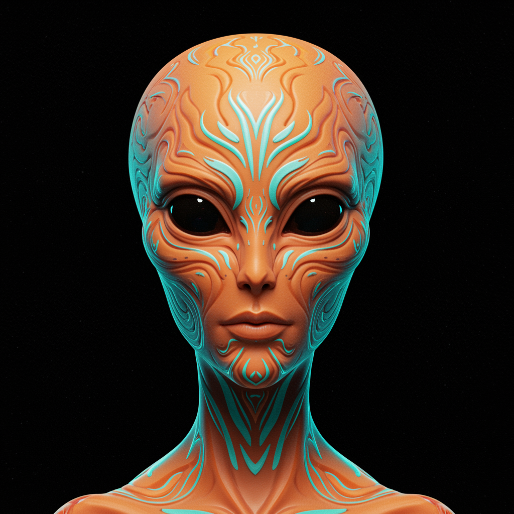 Radiant extraterrestrial portrait, featuring harmonious symmetry, infused with light orange and cyan hues; showcasing intricate facial features and elaborate portraiture, interwoven with sophisticated and complex patterns.