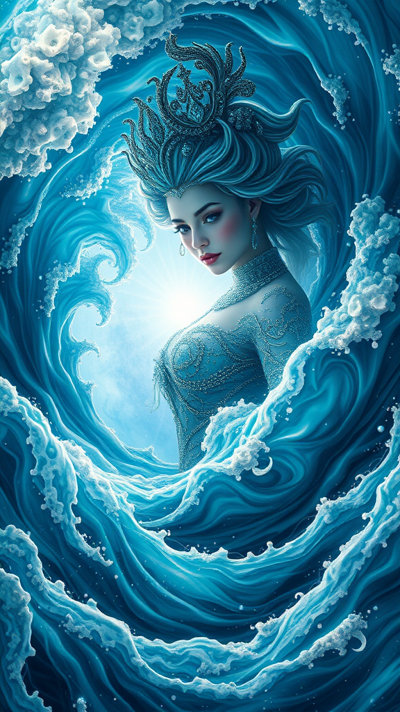 Radiant goddess Queen of the ocean enveloped in a swirling spiral of azure waves, set against a breathtaking and majestic backdrop. Her face exudes perfection with lifelike detail, her full form grounded elegantly amidst a sea of circuit patterns. Clad in intricately adorned garments, she embodies fantasy, rendered with hyper-maximalist detail true to dark fantasy style. The scene is crafted as a striking illustration reminiscent of ArtStation's finest, with a 3D Octane Render approach that ensures ultra-detailed and photorealistic concept art. The composition is sharply focused, with intense shadows and dramatic lighting shaping the narrative. Presented in 8k resolution for high-definition wallpaper quality, the image captivates with its HDR brilliance and exceptional detail, while maintaining an otherworldly yet tangible allure.