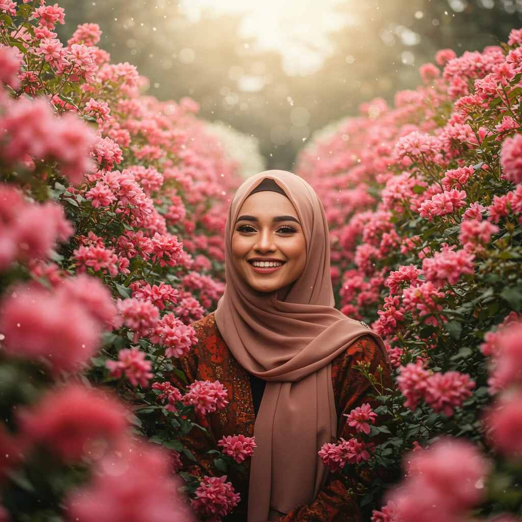 Radiant Hijabi Woman grinning amidst vibrant blossoms, glistening with dewdrops, cinematic glow, ultra-realistic, inspired by karol bak, aspect ratio 9:16.