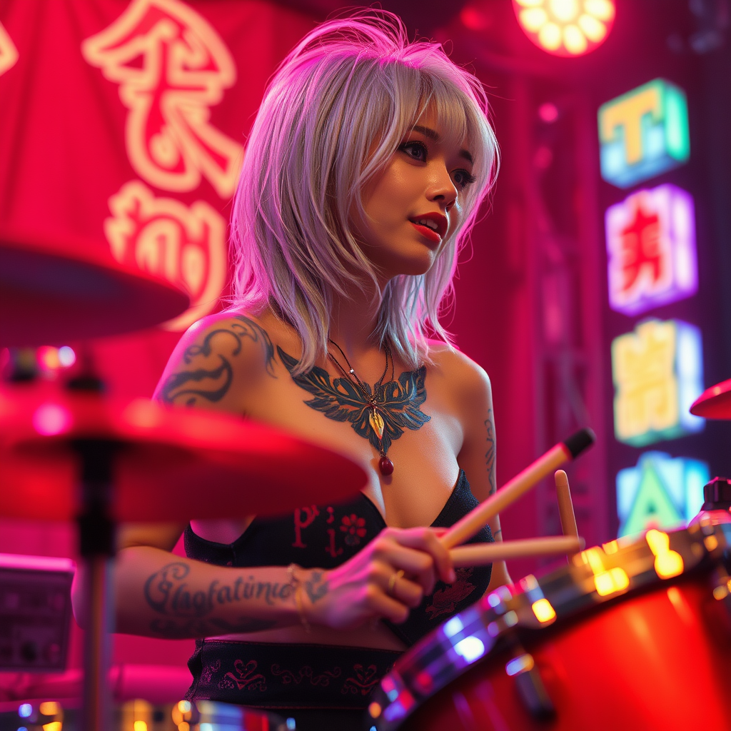 Radiant Japanese woman with silver hair captivating the stage, skillfully playing the drums amidst vibrant neon lights; adorned with intricate tattoos that tell a story. The scene captured with stunning realism showcases detailed skin textures and cinematic lighting, rendered in sharp 8k definition with a masterful blend of hyperrealism and diffused soft lighting. The photograph evokes depth through a shallow depth of field, and the atmosphere is enriched with cinematic noise and real shadows, creating a vivid, immersive experience.
