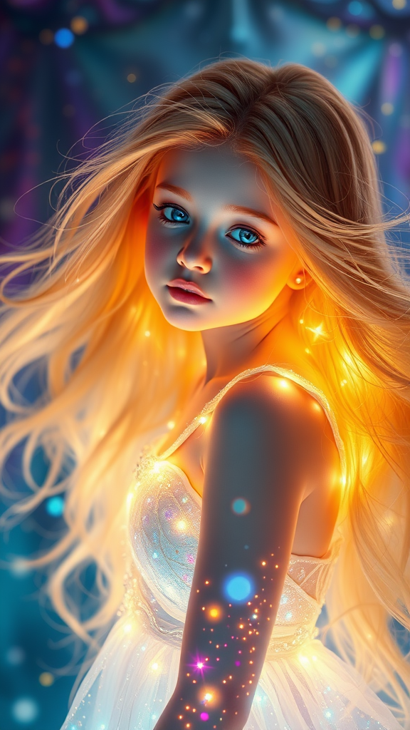 Radiant magical girl with flowing golden hair that shimmers with luminescent sparkles, set against a vibrant backdrop, her presence exudes an enchanting bioluminescent glow in exquisite 8k detail.