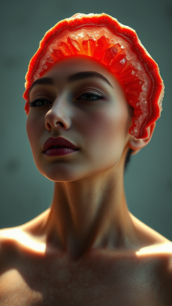 Radiant woman, three-quarter head to shoulders portrait, crafted from shimmering red Crystal Geode, elegantly split to reveal intricate crystal formations within, adorned with smooth marble-like skin, capturing surrealistic essence in conceptual photography, aspects subtly enhanced with artistic flair.