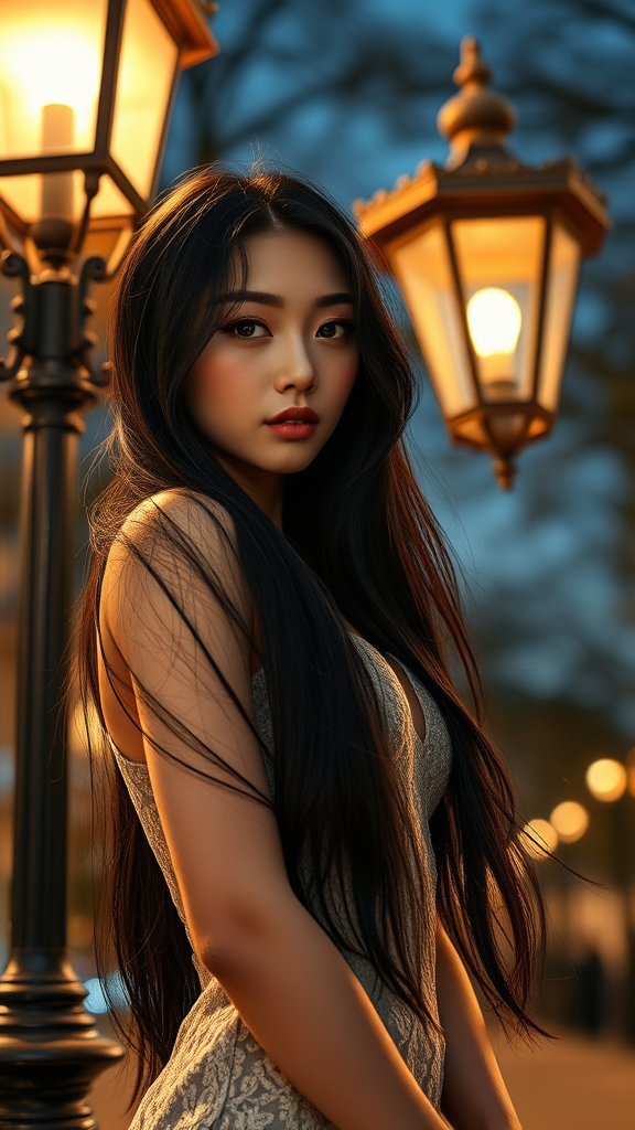 Radiant young woman with striking features, long flowing black hair, and a slender, graceful physique, elegantly posed beneath a vintage lamppost. The scene captures her essence in a glamorous anime-inspired style, with beautiful, cinematic lighting that enhances the photorealism. The details are impeccable and intricate, accentuating her elegance in a hyper-realistic manner. Volumetric lighting casts dramatic shadows and highlights, captured through the lens of a 150mm camera for a cinematic feel. The environment exudes a dreamy ambiance, ensuring clarity and focus on her captivating presence amidst the softly illuminated evening, maintaining a flawless, aesthetic rendition without imperfections.