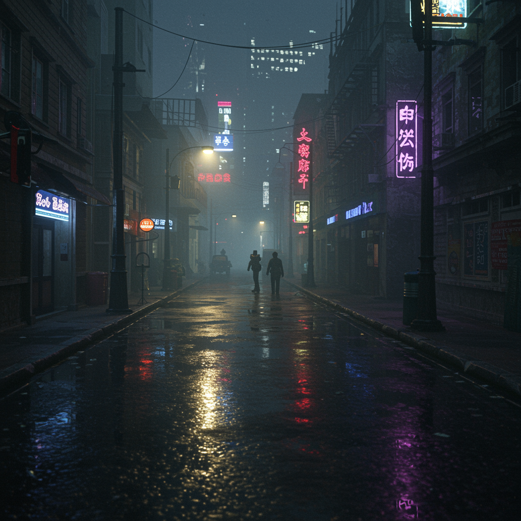 a gloomy, rain-soaked cityscape, shadows stretching across slick streets, the distant glow of neon lights reflecting on puddles, muted sounds of footsteps and distant thunder, a sense of mystery in the air
