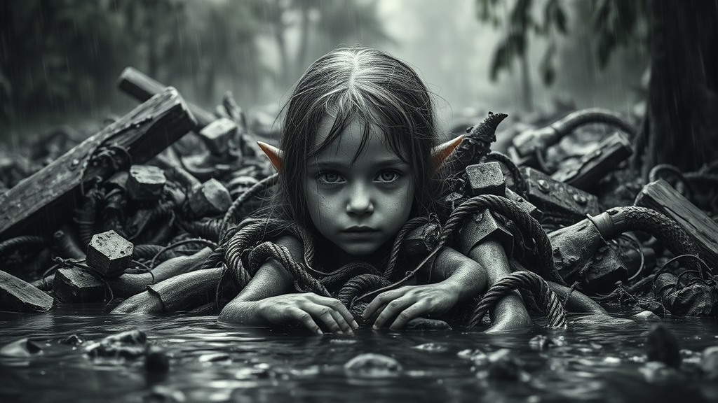Rain-soaked jungles and murky swamps merge in a watery landscape, where a young elven girl's face emerges, centered amidst chaos. Her youthful beauty is hidden by a massive accumulation of diverse debris encircling her, reminiscent of being submerged. The scene is a stark contrast of innocence against disarray, featuring poorly rendered anatomy with mutated, disconnected limbs, and blurry, oversaturated elements. It evokes a provocative composition, blending dark, black-and-white tones with chaotic, malformed structures, giving an impression of ugliness and disturbance.