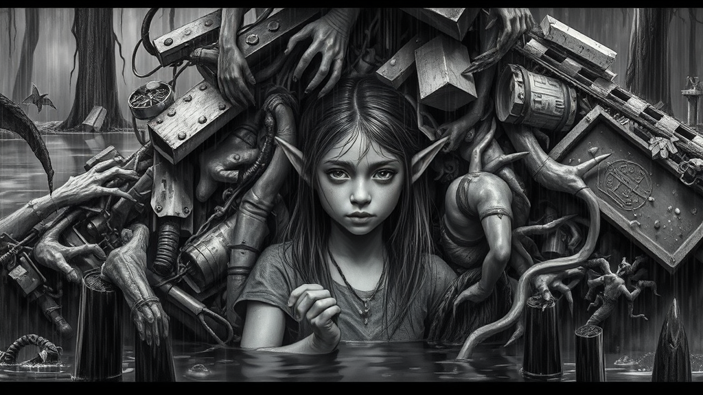 Rain-soaked jungles and murky swamps, with water everywhere, a young elven girl centered in the frame, her beauty hidden beneath a chaotic heap of varied debris encircling her, almost as if she's engulfed by it. There's a striking contrast between her youth and the chaos, the surrounding clutter creating a dark, provocative composition in black and white. The imagery suggests a poorly drawn scene with distorted anatomy, extra or missing limbs, floating disconnected limbs, and odd mutations. It's an unsettling, unattractive depiction, with elements that are blurred, over saturated, and suggestive of disfigurement.