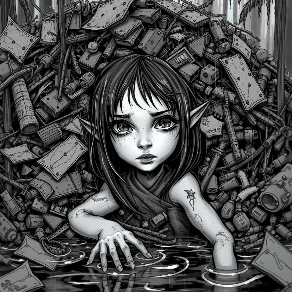 Rain-soaked jungles and swamps filled with overflowing water, featuring a young pile elf girl whose face is centered amidst an overwhelming mass of diverse debris, as if she's being engulfed by it. Her youthful beauty is contrasted by the chaotic clutter surrounding her, creating a provocative composition in dark shades of black and white. The scene is marred by poorly drawn elements, with distorted anatomy, extra or missing limbs, floating and disconnected limbs, evoking a sense of mutation and ugliness. Blurry, with a sense of amputation and oversaturation, the image portrays an unsettling clash between innocence and disorder.