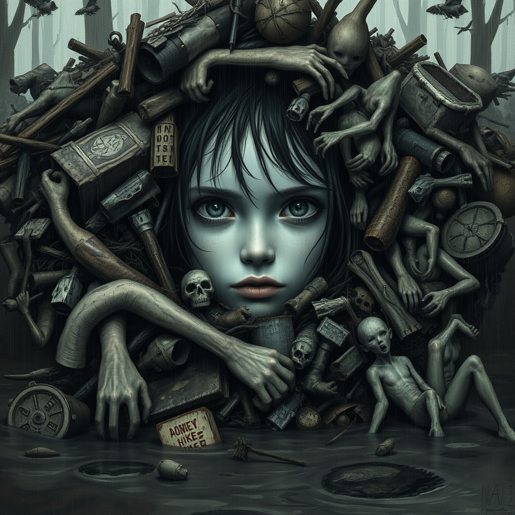Rain-soaked jungles and waterlogged swamps, an abundance of flooding, young pile elf girl's face takes center stage, her youthful beauty shrouded by a chaotic heap of diverse debris encircling her, giving the impression she's overwhelmed by it, contrasting youth against the disorder of surrounding refuse, an evocatively composed scene with dark, monochromatic tones, elements of poorly drawn figures, distorted anatomy, an additional limb here, a missing one there, limbs floating or disconnected, hints of mutation, grotesquely ugly, disturbingly blurred, images of amputation, all in an overly saturated aesthetic.