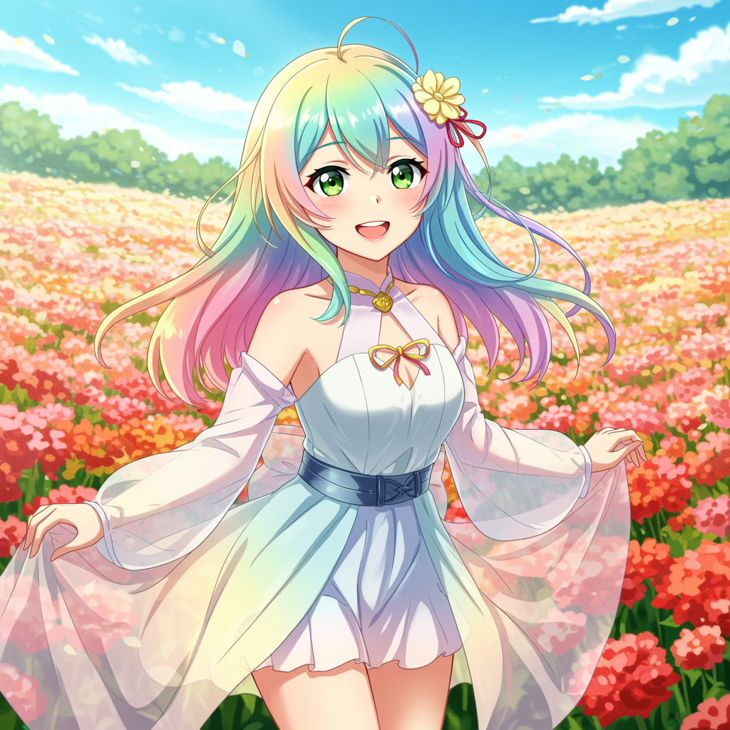 A girl with pastel rainbow hair and captivating olive green eyes stands gracefully in a vibrant flower field. She wears a delicate light rainbow and white dress that flows around her. Her expression radiates happiness with a cute, endearing smile. The scenery is painted in soft, soothing colors with blooming flowers swaying gently in the breeze, creating a serene and joyful atmosphere. Her presence is a perfect blend of elegance and charm, capturing the essence of an ethereal anime character.
