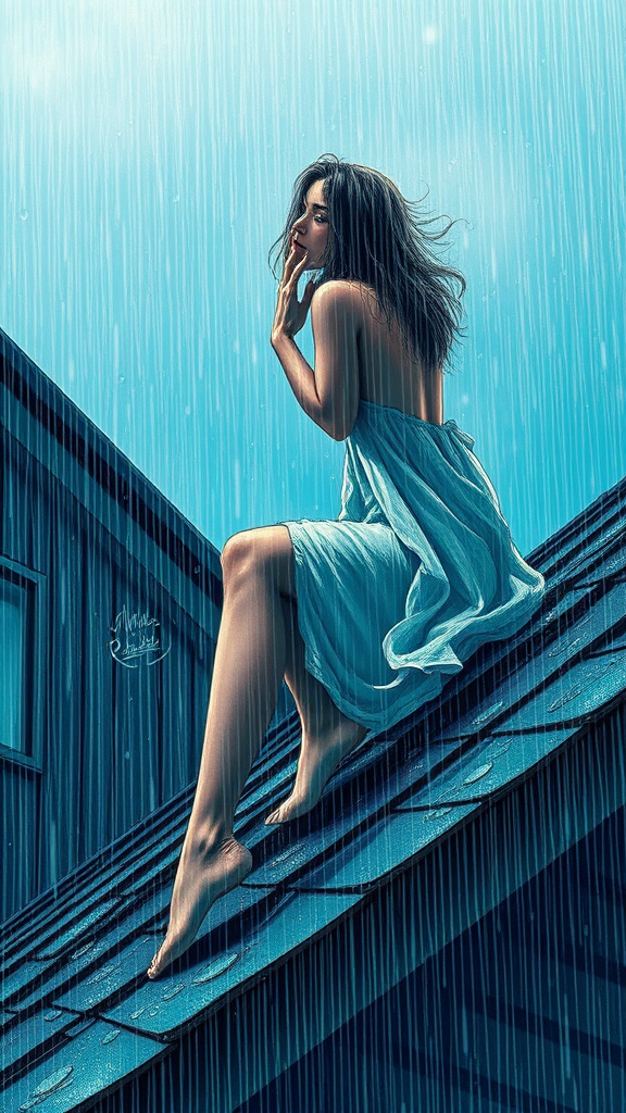 Raindrops cascading on the roof, a soothing pitter-patter lullaby, offers a cleansing embrace for the soul. A dynamic pose takes center stage, presenting a key visual of intricate, highly detailed art, encapsulating breathtaking beauty. The precise lineart, coupled with vibrant hues, contributes to a comprehensive cinematic experience. Inspired by the styles of Carne Griffiths, Conrad Roset, and Anna Dittmann, the artwork retains an overcast ambiance. The composition remains true to its core concept, avoiding errors such as missing or extra digits, poor anatomy, or disfigurements. The piece is free of artifacts such as watermarks and text, ensuring a clear and focused presentation of its aesthetic elegance.