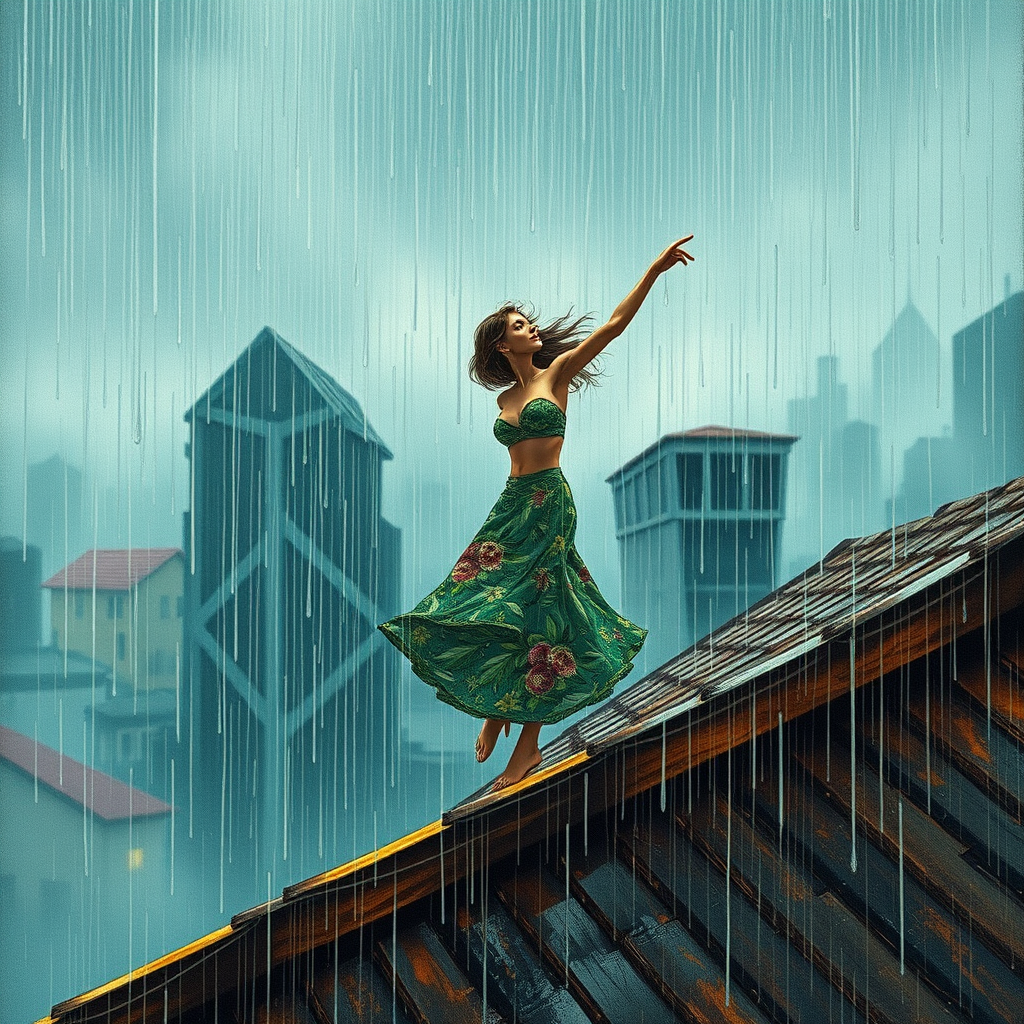 Raindrops dance on the roof, a gentle pitter-patter lullaby, offering a cleansing for the soul. A figure stands in a dynamic pose at the center of this scene, embodying intricate and highly detailed beauty. The composition showcases breathtaking artistry with precise linework and vibrant hues. It evokes a comprehensive cinematic experience, reminiscent of works by Carne Griffiths, Conrad Roset, and Anna Dittmann. An overcast ambience adds depth to the atmosphere. In this visually stunning portrayal, all elements come together harmoniously, avoiding any errors or distortions, and celebrating the elegance of natural design.