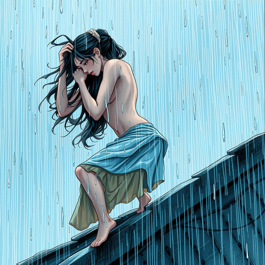 Raindrops dance on the roof, a soothing pitter-patter lullaby, offering a cleansing for the soul. The scene captures a dynamic pose, centered as the key visual with intricate and highly detailed craftsmanship. The beauty is breathtaking, with precise lineart and vibrant colors delivering a comprehensive cinematic experience. Influences from artists like Carne Griffiths, Conrad Roset, and Anna Dittmann shine through, even in an overcast setting. The artwork, free from technical errors like missing or extra digits, stays within frame boundaries, avoiding any deformed or disfigured elements. Despite its breathtaking complexity, there are no signs of jpeg artifacts, signatures, watermarks, or text disruptions. Every element is carefully rendered to ensure a harmonious and captivating composition.