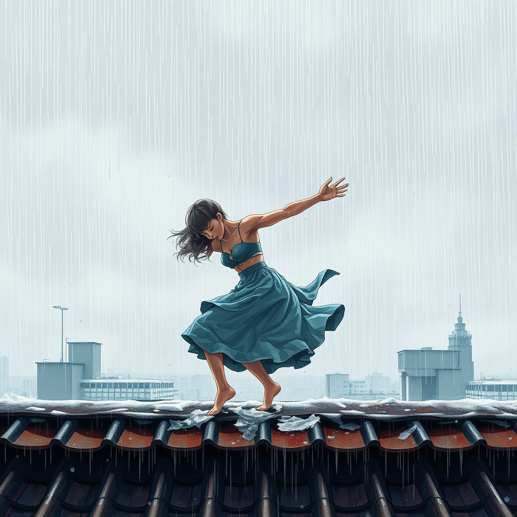 Raindrops gently dance on the rooftop, a soothing pitter-patter lullaby that cleanses the soul. A dynamic pose is captured at the center of this key visual, showcasing intricate and highly detailed artistry that exudes breathtaking beauty. The scene is rendered with precise linework and vibrant colors, creating a comprehensive cinematic experience reminiscent of Carne Griffiths, Conrad Roset, and Anna Dittmann's styles. Against an overcast backdrop, the image maintains its charm despite low resolution. It evokes a sense of serene beauty without distractions, presenting beautifully articulated figures and elements that meld seamlessly. The visual is free from errors, with perfectly illustrated anatomy and composition, devoid of anomalies like extra limbs or digits, resulting in a flawless, mesmerizing portrayal.