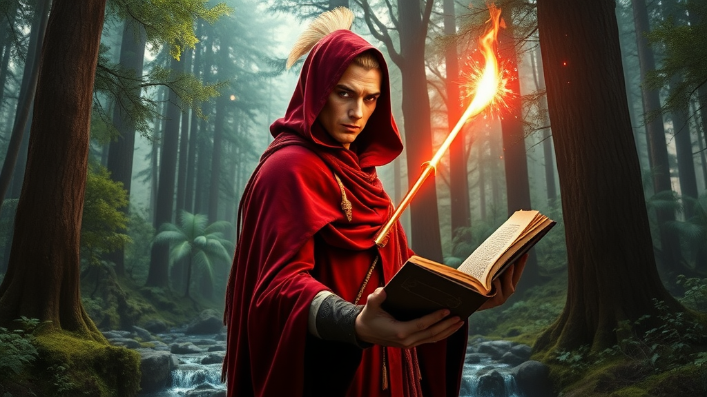 Raistlin the enigmatic sorcerer cloaked in his signature deep crimson robe stands tall and slender, his head shrouded beneath a red hood. He exudes a mysterious aura as his glowing wand illuminates the surroundings with a captivating light. His golden skin and distinctive mohawk set him apart in the lush elven forest, a realm alive with towering trees and a glistening stream. In his other hand, he holds an ancient magic book, its pages whispering secrets of the arcane. The scene is a cinematic masterpiece, framed with a subtle vignette that enhances the drama of the moment. The forest teems with an ethereal beauty, enveloped in an HDR glow that highlights the enchantment of this magical world.