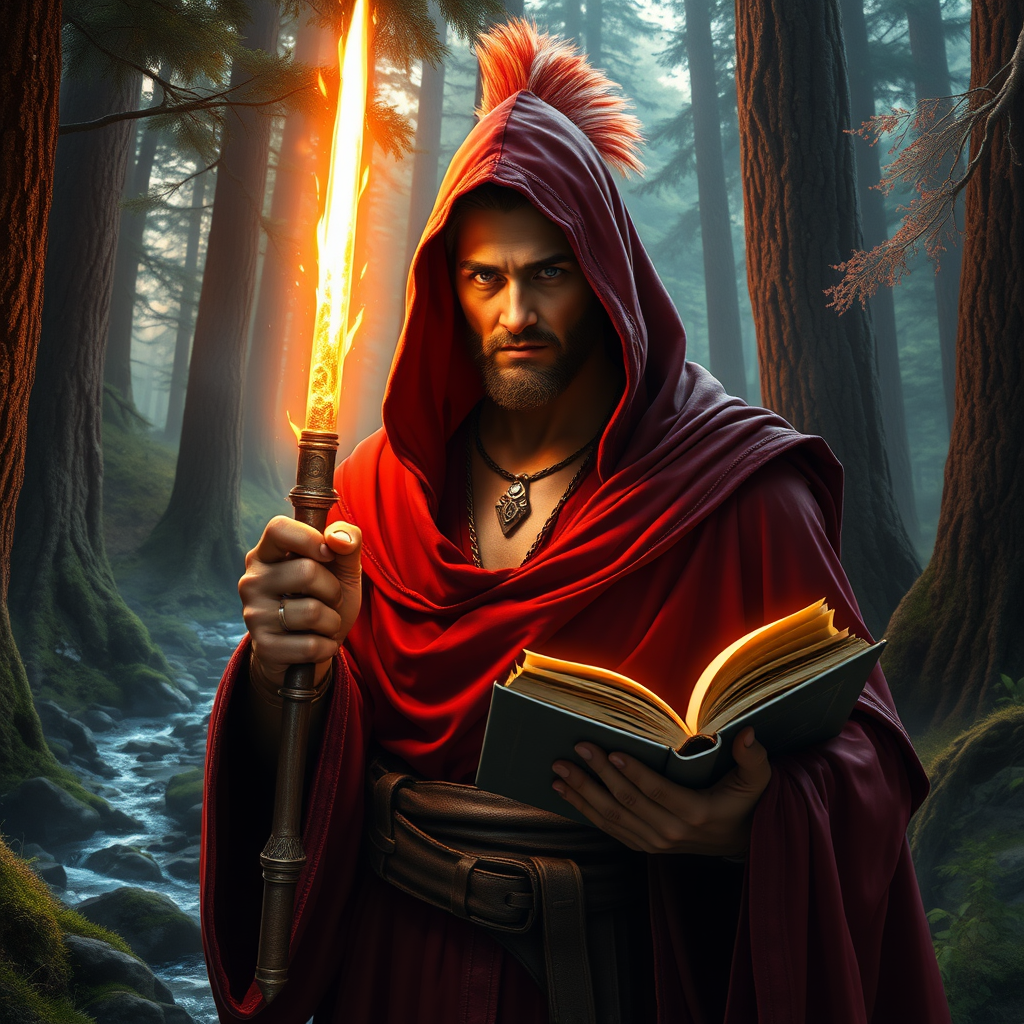 Raistlin, the enigmatic sorcerer, stands tall and slim with his head nestled inside a deep red hood, his signature robe cascading around him. His glowing wand emits a mesmerizing light, casting a warm glow on his golden skin. A vibrant mohawk adds to his intriguing presence. The lush elven forest surrounds him, with towering trees and a sparkling stream adding to the magical atmosphere. In his other hand, he holds a mystical book, its pages brimming with secrets of the arcane. This cinematic masterpiece captures the aura of mystery and power, enhanced by the vibrant hues of the magic forest. The scene is centered, with a subtle vignette adding a dramatic flair to the composition.