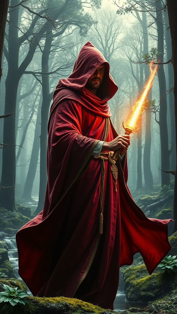 Raistlin, the enigmatic sorcerer, stands tall and slim with his head ensconced within a shadowy red hood. His signature red robe drapes around him, emanating an aura of mystery as his glowing wand illuminates the surroundings with a mesmerizing light. In a lush elven forest, the air is filled with the magic of towering trees and shimmering streams, creating a vivid HDR scene. The cinematic shot captures Raistlin at the center, enveloped in a dramatic vignette that enhances the masterpiece quality of the moment. Subtle creative modifications enhance the picturesque forest, emphasizing the mystique of Raistlin's presence without introducing fantastical anomalies or distortions.