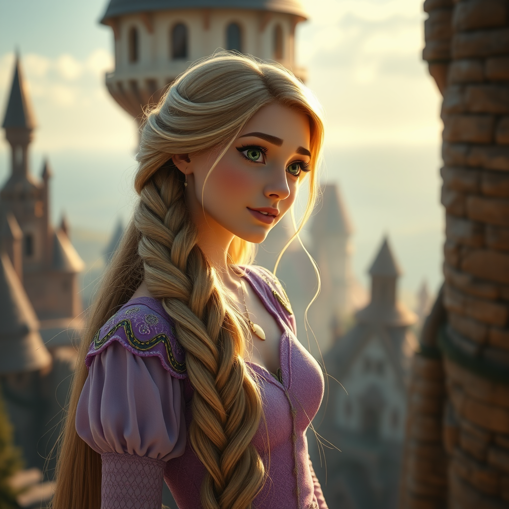 Rapunzel from Tangled as a stunningly realistic young woman with a long braid, meticulously sketching her tower, ultra high-definition 8k resolution, bathed in warm natural lighting with sunlight filtering through, masterpiece of photorealism, exceptional composition, slight creative touches to enhance the enchanting scene.