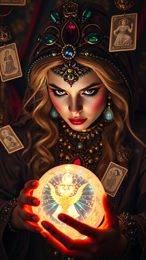 RAW, beautiful and aesthetic, official art, intricate and ultra-detailed, cinematic lighting with pronounced shadow, vibrant and colorful arcane aura, a captivating fortune teller with a shimmering crystal ball, adorned in jewels and surrounded by hovering tarot cards, captured in sharp focus with a 70mm lens for an 8k UHD HDR image. Embracing a sense of mystical allure, maintaining clarity without distractions such as low resolution, out-of-frame elements, or visual distortions. The scene is seamless without any intrusive artifacts, text, logos, or imperfections.