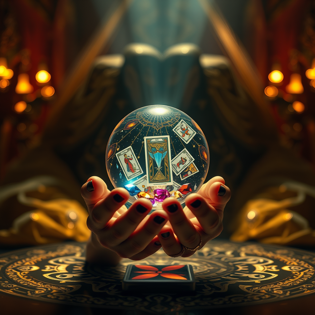 RAW, captivating and aesthetic, official art, exquisite details, ultra detailed, cinematic lighting, rich shadows, vibrant, mystical, aura, beam of light, enchanting fortune teller, crystal sphere, gems, floating tarot cards, sharp focus, depth of field, 70mm lens, 8k resolution, UHD, HDR, enhanced clarity, multiple exposure effects, mirror image, elongated features, intricate design, seamless composition, vivid focus, surreal harmony, abstract beauty, ethereal atmosphere, refined elegance, extraordinary presence, ambient energy, hypnotic gaze, timeless allure.