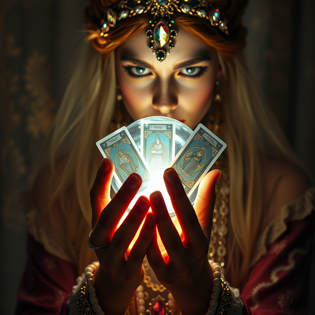RAW, captivating and aesthetic, official art, intricate details, ultra detailed, cinematic lighting, pronounced shadow, vibrant, arcane, ethereal aura, beam of light, mesmerizing fortune teller, crystal orb, adorned with jewels, tarot cards floating mid-air, sharp clarity, depth of field, 70mm, 8k, UHD, HDR, vivid clarity, enhanced details, beautifully unique appearance, hypnotic gaze, elegant posture, graceful fingers, imaginative elements, harmonious composition, enchanting ambiance, immersive scene, flawless focus, pristine imagery.
