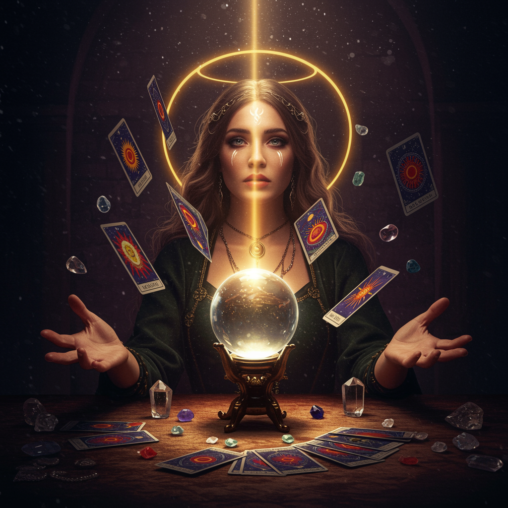 RAW, enchanting and aesthetic, official art, intricate details, ultra detailed, cinematic lighting, defined shadow, vibrant, mystical, halo, beam of light, mesmerizing fortune teller, crystal ball, gemstones, tarot cards suspended in the air, sharp focus, depth of field, 70mm, 8k, UHD, HDR, refined art techniques, dreamlike, ethereal atmosphere, elegant mysticism, storytelling composition, unified elements, harmonious visual flow, avoiding unnecessary duplication, maintaining clear expressions, proportionate form, natural gestures, coherent imagery, focusing on high resolution, seamless frame, crystal clarity, avoiding distractions, pure artistic vision.