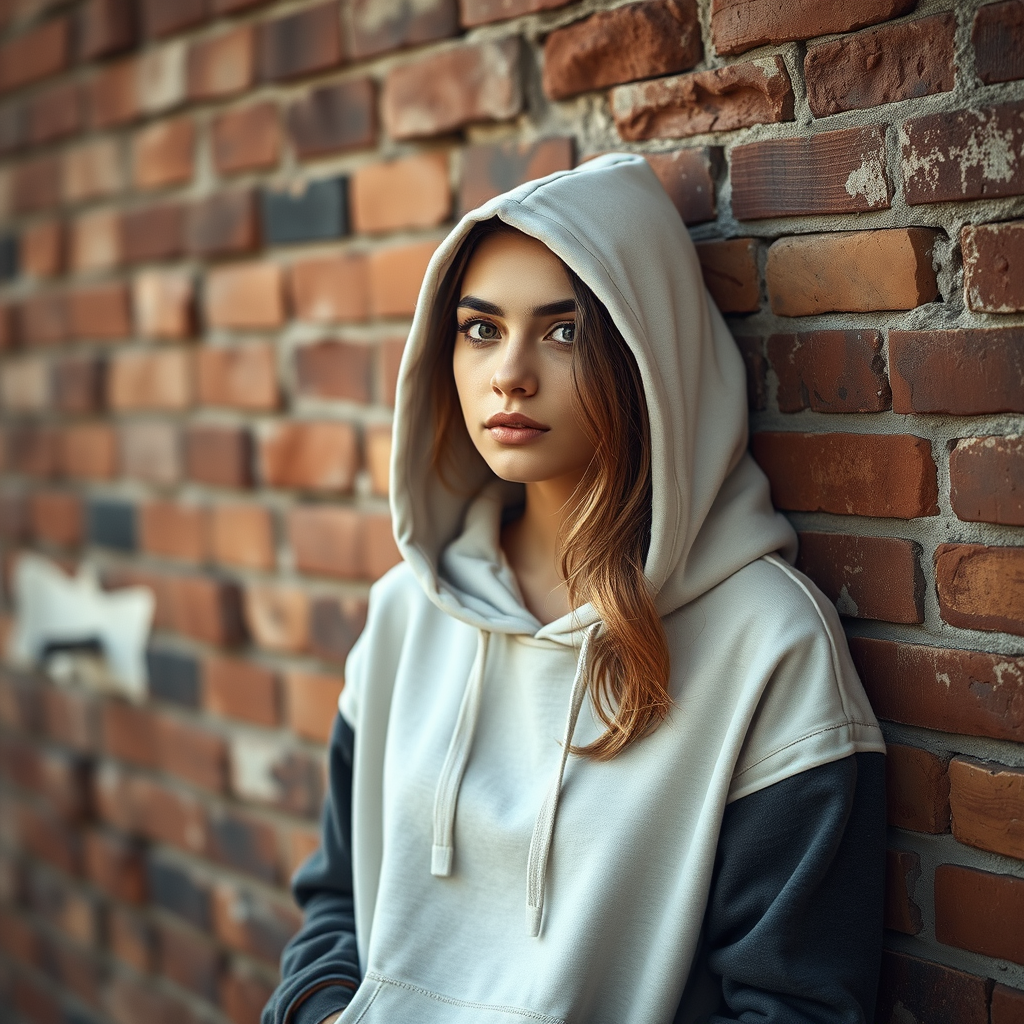 RAW image, captivating young woman in a hoodie leaning against a rustic brick wall, minimalist attire, ultra-detailed photography, gentle light, popular on ArtStation and Pixiv, highly detailed, crisp focus, visually appealing, 8k ultra high-definition, digital camera, elaborate details, subtle illumination, premium quality.