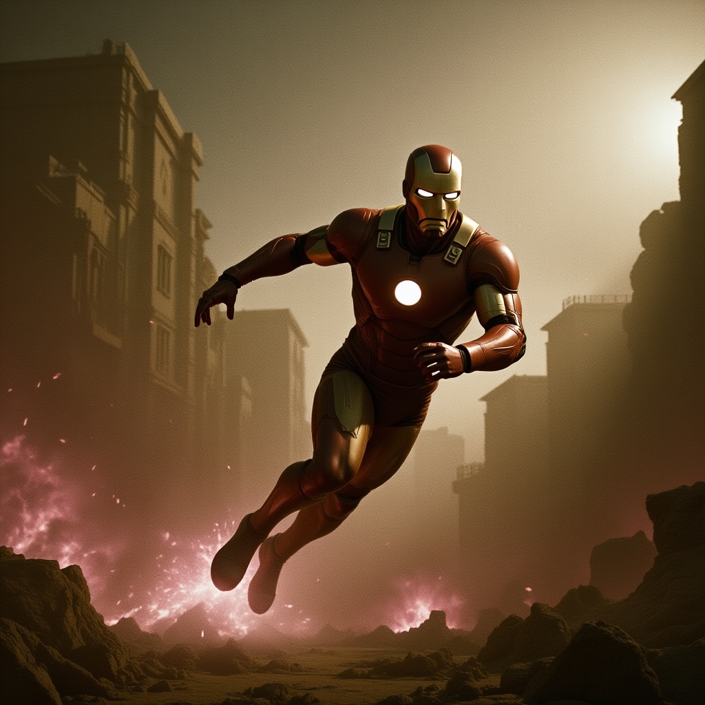 RAW image of Ironman soaring mid-flight in a dynamic and explosive scene, capturing a strong sense of action and impending danger, with a backdrop of city ruins. Captured in 8k ultra-high definition using a DSLR, the lighting is soft yet dramatic, showcasing a high-quality finish with film grain reminiscent of a Fujifilm XT3 illustration. The scene is rendered in 3D with a sepia tone, blending elements of painting, cartoon, and sketch styles. The image possesses a subtle analog photo quality with hints of pink tones and an intentional low-resolution touch to add character, while avoiding exaggerated features or cartoonish anatomy, presenting Ironman in a balanced and iconic pose.