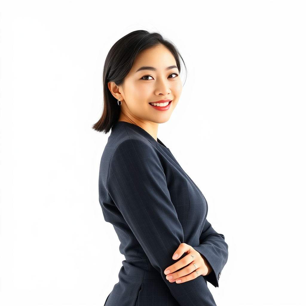 RAW image of a confident and attractive business professional from Asia with a slender build, set against a pristine white background. Captured in 8k ultra-high-definition using a DSLR camera, the photograph boasts soft, flattering lighting and high-quality film grain. Shot with a Fujifilm XT3, the image embodies an elegant and polished aesthetic.
