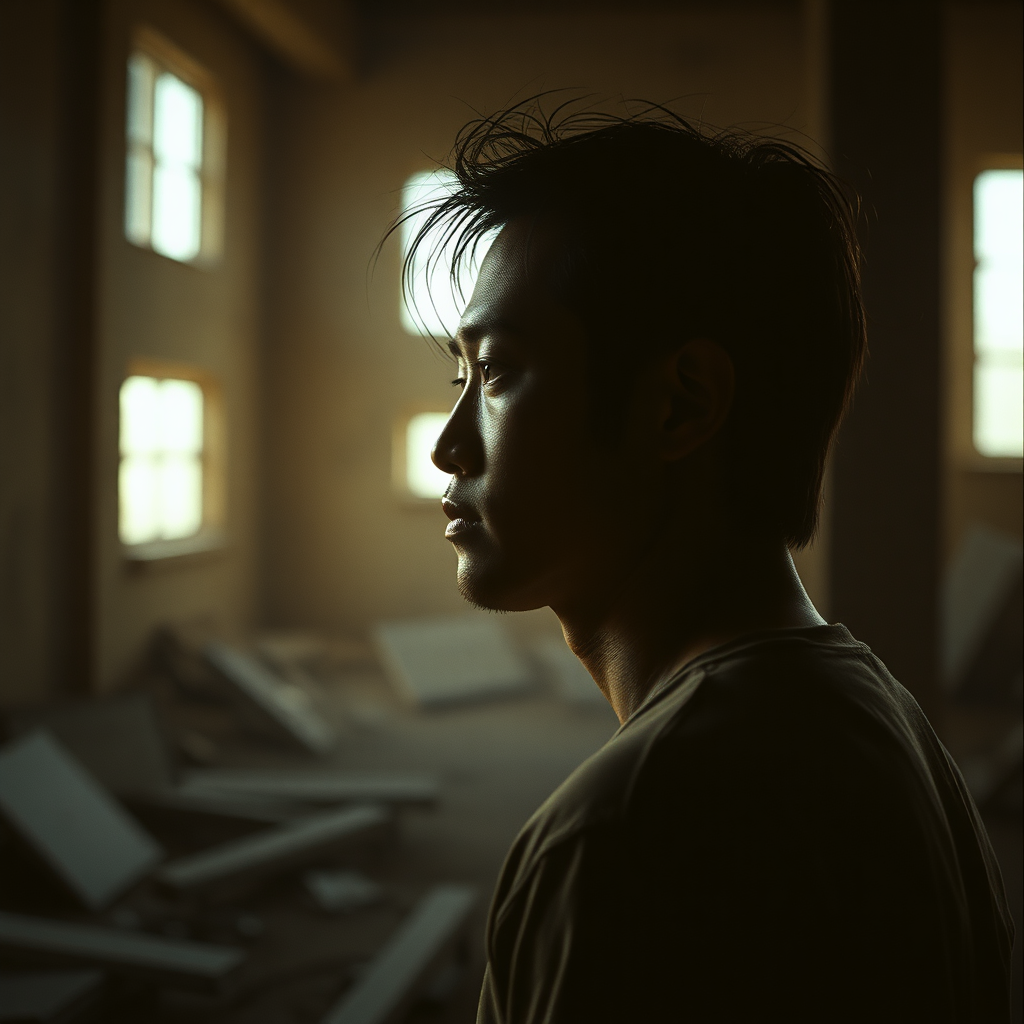 RAW photo, 8k uhd, dslr, gentle illumination, premium quality, subtle film grain, Takeshi Kaneshiro, side profile portrait, Leica 85mm lens, Kodak Portra 800 film, dramatic chiaroscuro, f1.4 aperture, apocalyptic ruins, intense, contemplative, cinematic, 4k highly detailed image shot on Kodak with intricate bokeh, inspired by the dramatic universe of The Last of Us.