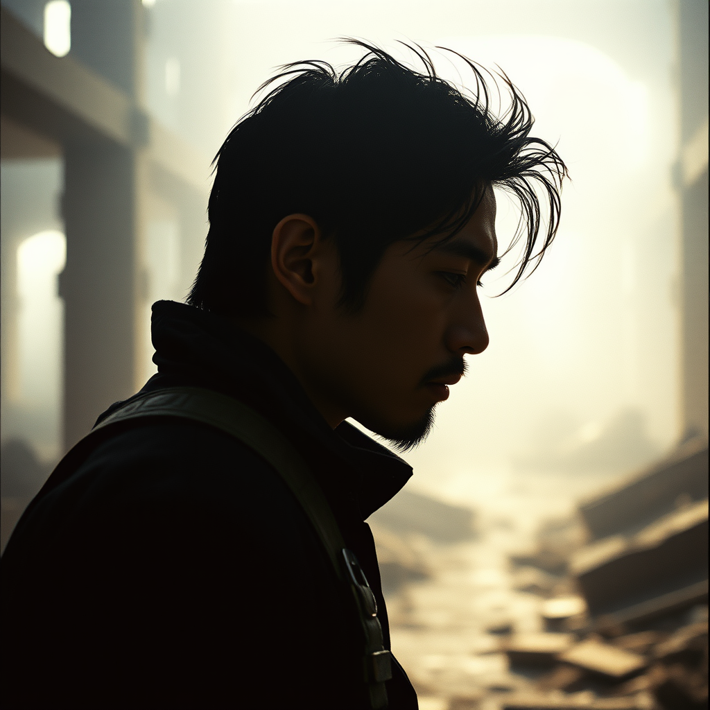 RAW photo 8k uhd dslr soft lighting high quality film grain Takeshi Kaneshiro side profile Leica 85mm Kodak Portra 800 chiaroscuro f1.4 post-apocalyptic ruins intense stoic cinematic 4k detailed photograph shot on kodak with a soft blurred bokeh capturing the essence of a dramatic scene akin to HBO's The Last of Us.