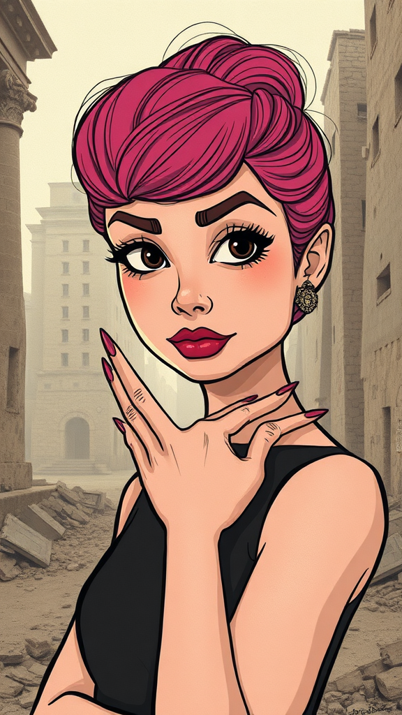 RAW photo, Audrey Hepburn in city ruins, 8k uhd, dslr, soft lighting, high quality, film grain, Fujifilm XT3 inspired illustration, 3d, sepia tone, painting style, cartoon-like elements, sketch effect, low resolution with intentional imperfections, surreal anatomy, unique hand features, average quality, quirky attributes, unusual eyeshadow, multiple eyebrow layers, vibrant pink hair, analog photo aesthetic.