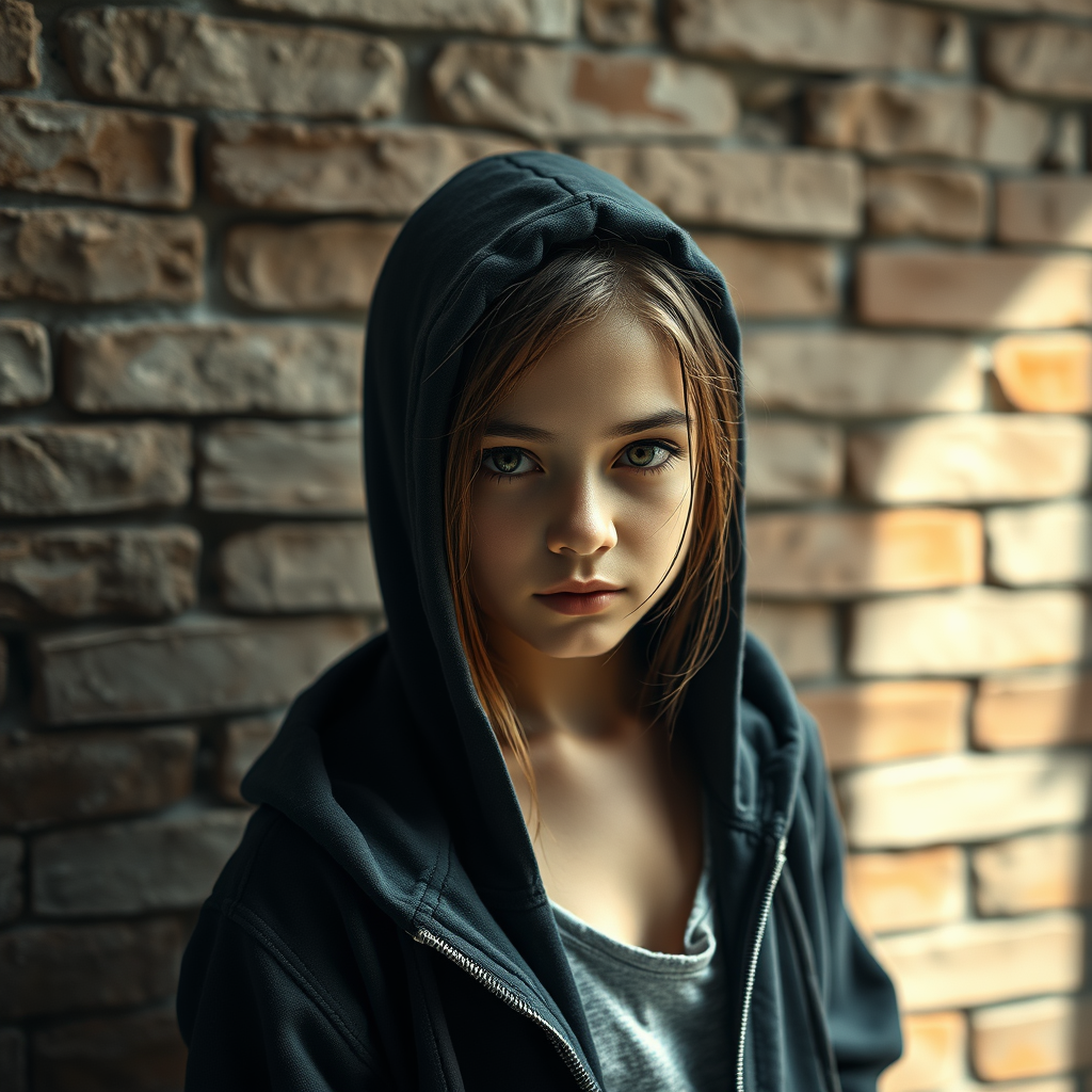 RAW photo, captivating girl in a stylish hoodie against a textured brick wall, photography, revealing shirt, hyperdetailed focus, soft natural light, gaining traction on ArtStation and Pixiv, high-definition detail, sharp focus, aesthetic appeal, 8k resolution, DSLR quality, intricate detailing, soft lighting, high quality, experimental elements, surreal features, interesting distortions, unique proportions, abstract elements, artistic interpretation, unusual features, unconventional aesthetics, embracing imperfections, digital enhancement, creative expression, abstract anatomy, intriguing lighting, visual interest, artistic flair, inventive angles, imaginative modifications, bold concepts, expressive elements, intriguing render.