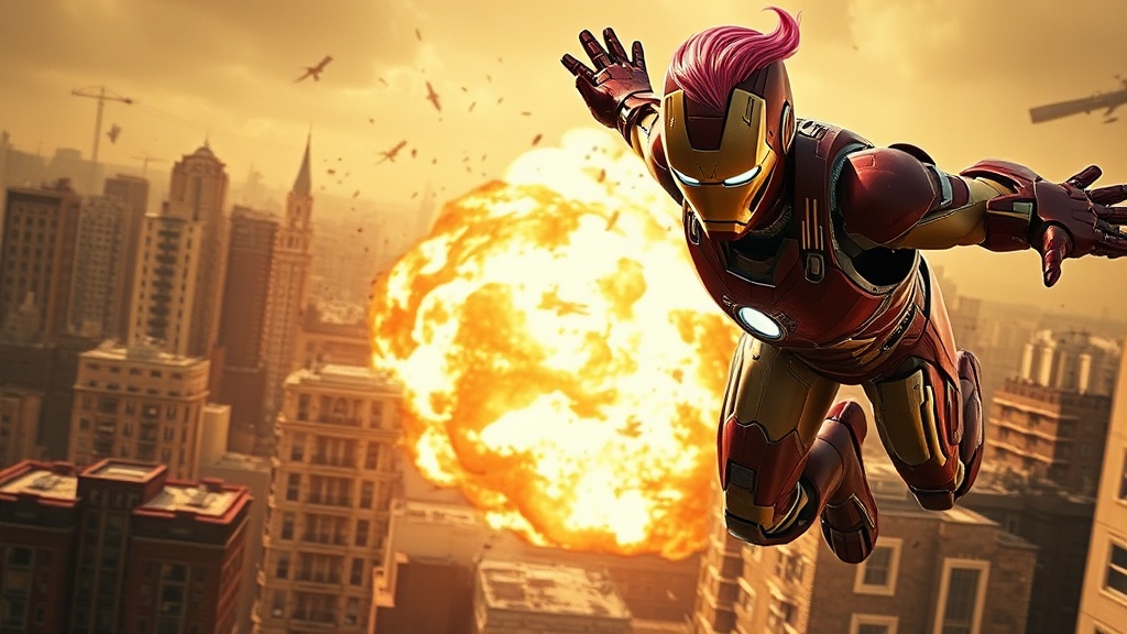 RAW photo of Ironman soaring through the air amidst a dynamic and intense explosion, encapsulating a thrilling sense of action and peril, with a backdrop of a war-torn cityscape. Captured in 8k uhd using a DSLR with soft lighting, the scene blends high-quality film grain reminiscent of a Fujifilm XT3 illustration. The image takes on a 3D, sepia-toned appearance, combining elements of painting, cartoons, and sketch for a unique visual style. Despite its high resolution, there are deliberate artistic touches of low resolution in some areas, accompanied by abstract interpretations like unconventional anatomy, vibrant pink hair, and multiple eyebrows. The scene carries an analog photography aesthetic, with parts appearing slightly out of frame to enhance its surreal quality.