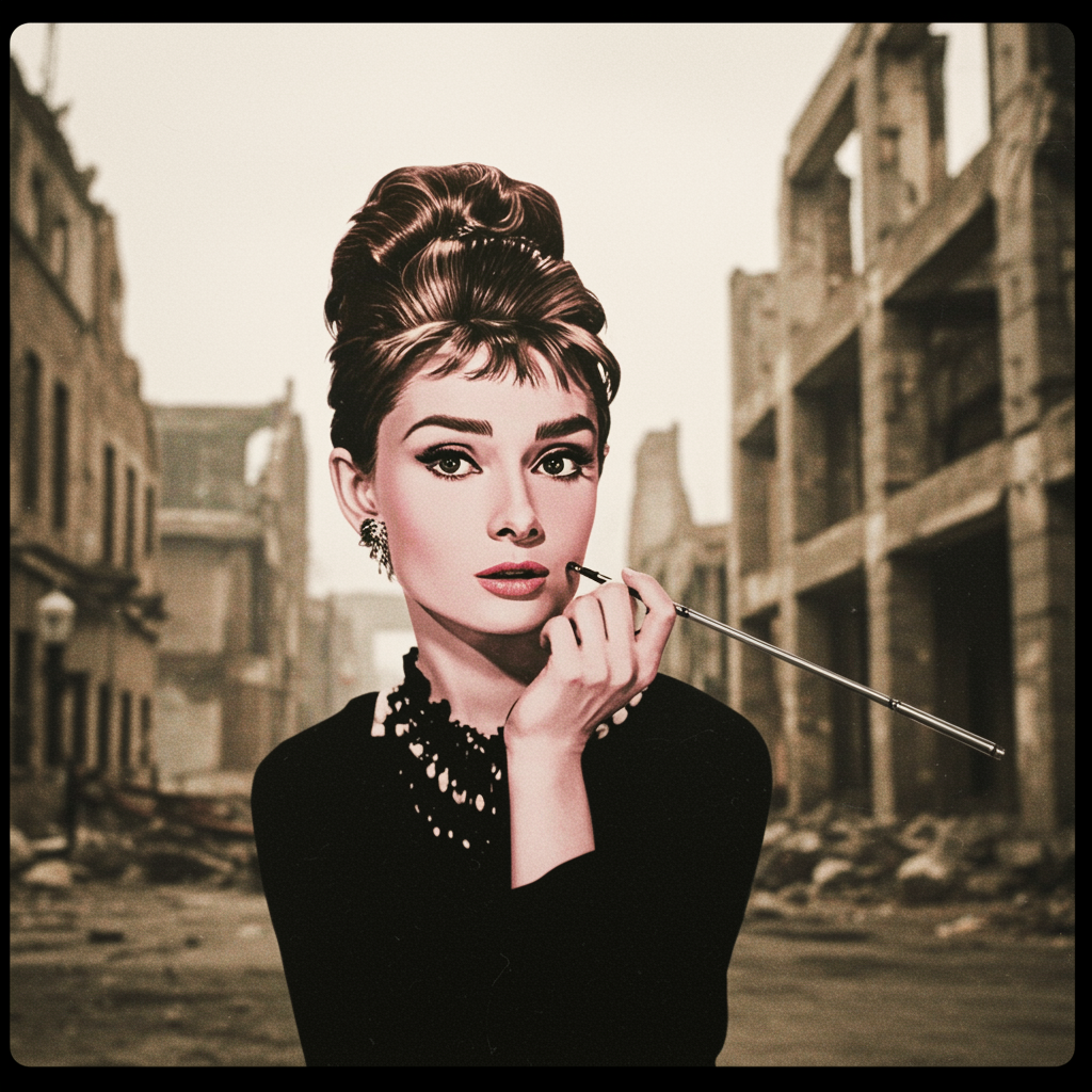 RAW photo of Audrey Hepburn in a city ruins background, captured in 8k UHD with a DSLR. Featuring soft lighting and high-quality film grain, inspired by Fujifilm XT3. The scene blends illustration and 3D elements with a sepia-toned painting style. Cartoonish sketches add a unique twist, incorporating pink hair and an analog photo aesthetic. Subtle imperfections add character, with intriguing details like collapsed eyeshadow and multiple eyebrows, all contributing to a nostalgic yet surreal visual experience.