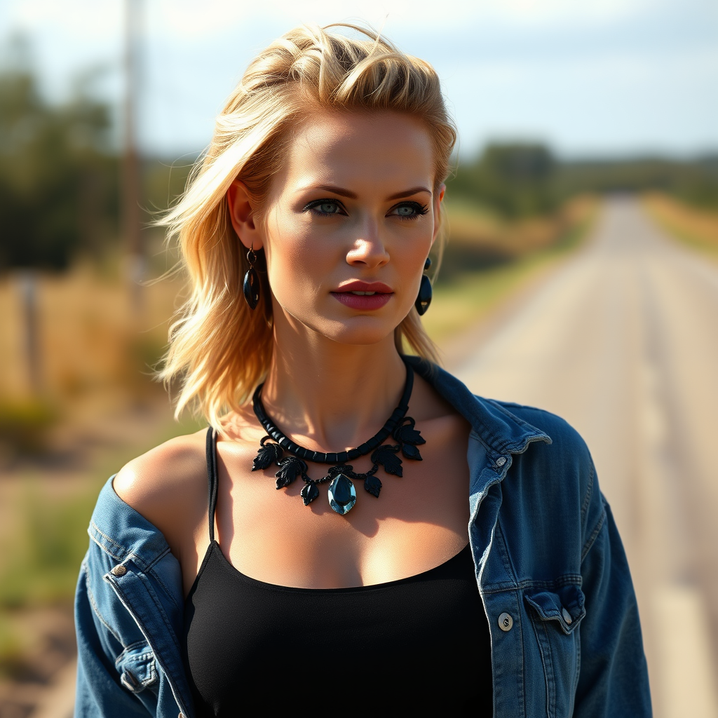 RAW photo, image of Charlize Theron with elegant makeup, blonde hair, standing outside on a country road, wearing jeans and a black tank top. She exudes a flirty elegance with her styled hair. The picture is taken in 8k resolution, capturing a real, high-quality masterpiece. She accessorizes with a goth-inspired necklace and earrings, while her outfit is complemented by a denim shirt. The background is slightly blurred to focus on her presence, capturing the essence of a bright, clear day. The composition avoids any imperfections or errors, ensuring a seamless and natural appearance.