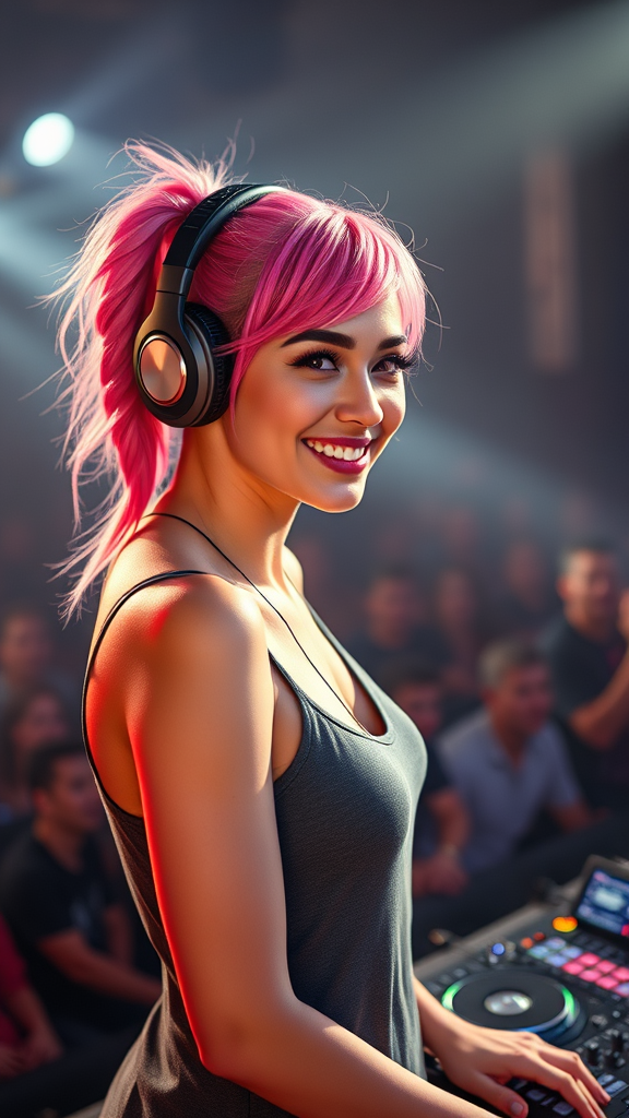 RAW photo of a 24-year-old female DJ with a slender build, vibrant pink hair styled in a messy ponytail weave, wearing detailed headphones with a medium smile, standing confidently on a stage; captured in 8k with incredible clarity and realism, featuring cinematic lighting, high-resolution detail, and professional color grading enhanced with subtle film grain. The atmosphere is lively and dynamic, reflecting the energy of the music and crowd, while focusing on natural human proportions and expressions, maintaining artistic integrity and realism.