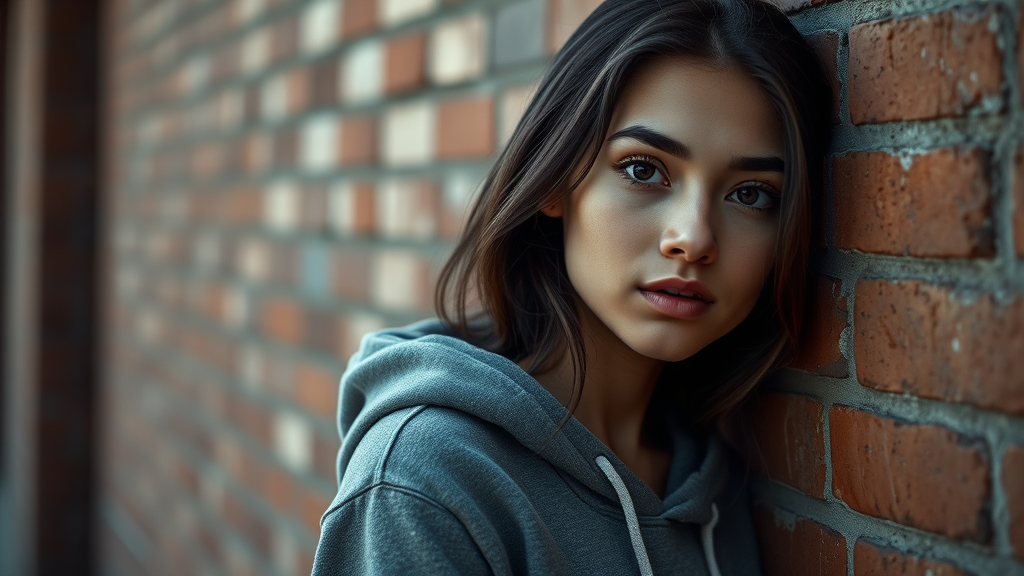 RAW photo of a striking young woman in a hoodie leaning against a brick wall, captured in a hyperdetailed and sharp focus style with soft lighting that enhances the scene's aesthetic appeal. The image is inspired by high-quality photography seen trending on platforms like ArtStation and Pixiv. It features an 8k ultra-high-definition resolution with intricate details throughout. The composition emphasizes the girl's natural beauty and the textured background. The scene is designed to highlight high-quality craftsmanship with a focus on artistic expression and visual storytelling, celebrating the authenticity and dynamic presence of the subject in harmony with the setting.