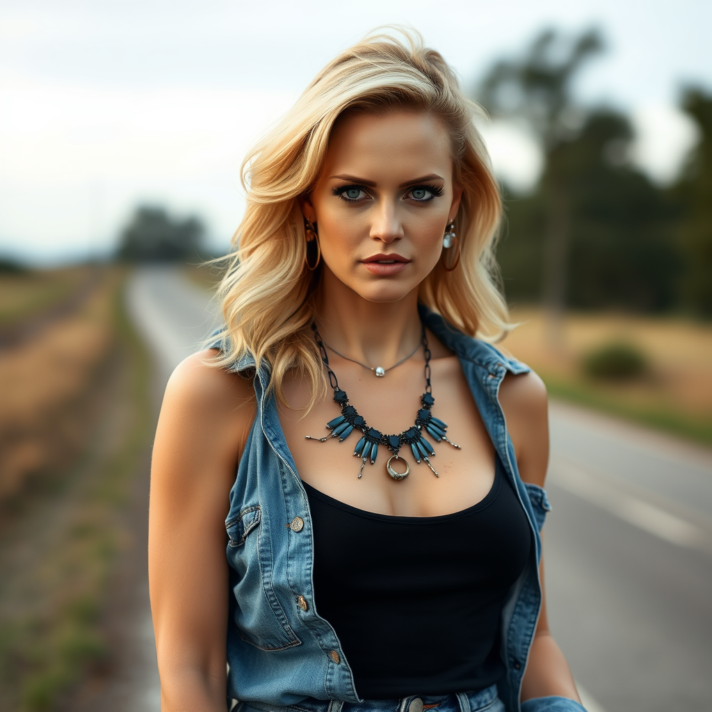 RAW photo of Charlize Theron with elegant makeup and blonde hair, standing on a country road. She's wearing jeans and a black tank top, exuding a flirty and elegant vibe. The photo is captured in 8k resolution, showcasing her in a natural outdoor setting. Her hair is styled elegantly, adding a touch of glamour. She is accessorized with a goth-style necklace, earrings, and loops, with her bangs softly framing her face. The denim shirt over her outfit adds a casual yet stylish layer. The background is subtly blurred, enhancing the focus on her. Avoids any distortions or low-quality elements, ensuring the photo is clear and lifelike.