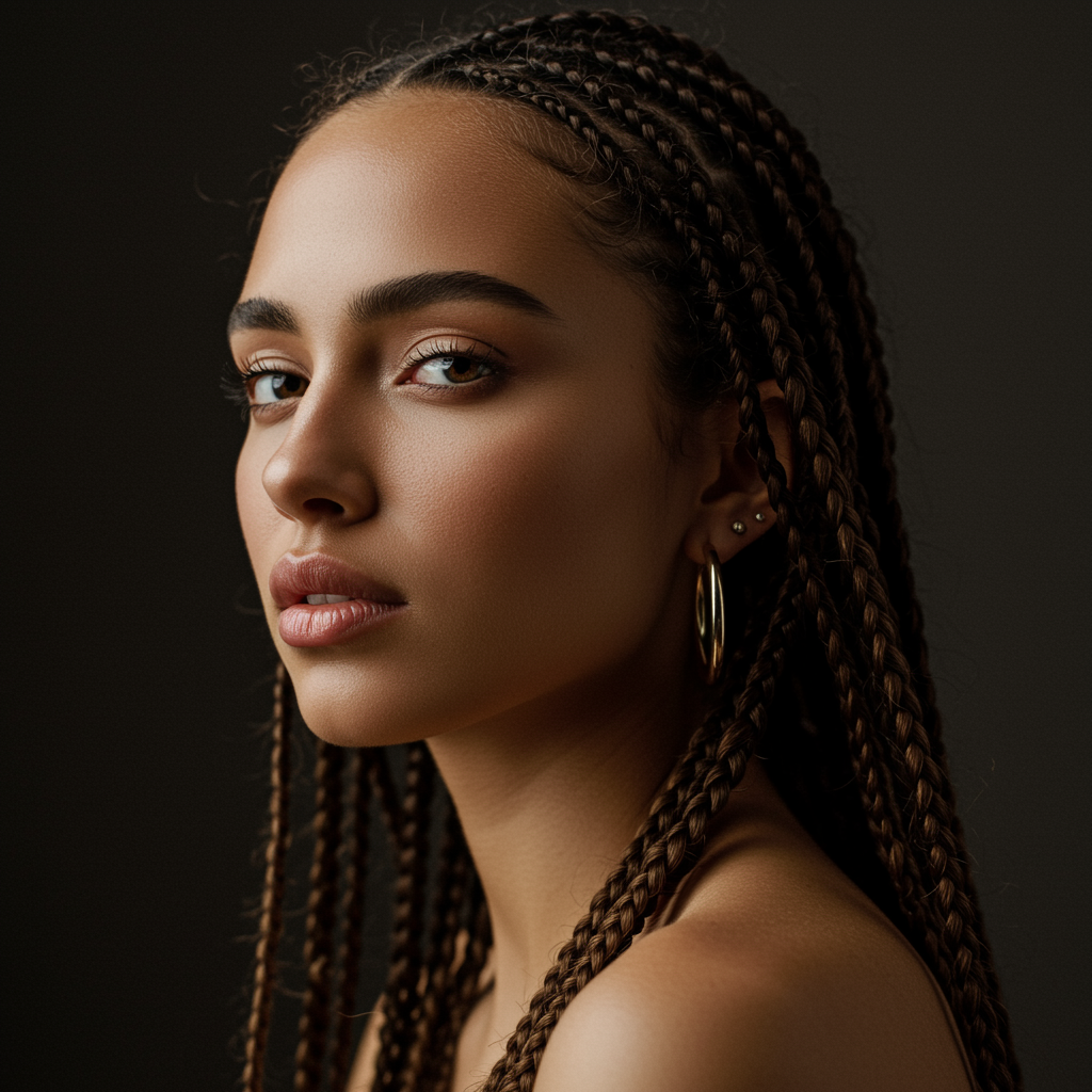 RAW photo, portrait of a stunning woman, hyperdetailed photography, soft lighting, head and shoulders view, 80mm, f22, highly detailed, trending on art platforms, clear focus, beautifully aesthetic, 8k UHD, professional DSLR, intricate details, gentle illumination, superior quality, braids, close-up, excluding distracting elements like poor quality or deformations, ensuring natural anatomy and well-proportioned features, maintaining clarity and elegance without distortion or unnatural alterations.