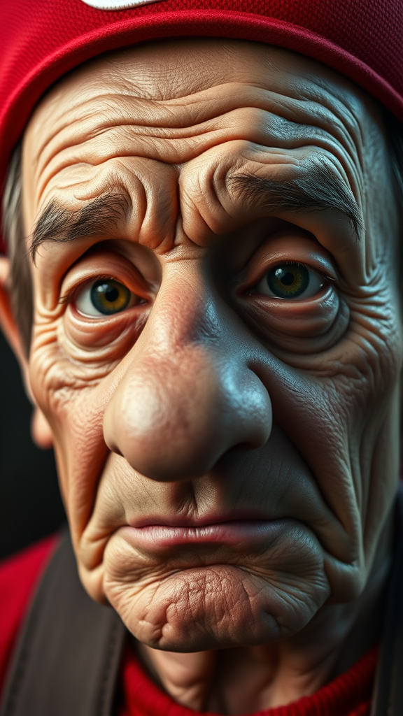 RAW photo, portrait of an aged Mario character, intricately detailed textures, weary expression, pronounced skin lines, red Mario cap, optimal lighting, ultra-realistic feel, sharp focus, enriched depth of field, 8K UHD quality, captured with a Sony Alpha 1, 85mm lens, f/1.4 aperture, 1/500 shutter speed, ISO 100, neutral and subdued color palette, subtle imperfections, oddities, unintended artifacts, unsightly, distorted features, incomplete elements.
