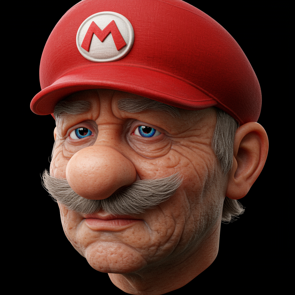 RAW photo, portrait of an elderly Super Mario, showing detailed textures and a weary, aged appearance, with pronounced skin pores. He is wearing his signature red Super Mario hat. The lighting is perfect, capturing a photo-realism essence with a hard focus and smooth depth of field. Shot in 8K UHD using a Sony Alpha 1 camera with an 85mm lens at f/1.4 aperture, 1/500 shutter speed, and ISO 100, the colors are neutral and slightly desaturated. The portrait evokes realism and character, while subtly avoiding any unattractive or flawed elements typically associated with negative imagery. His expression conveys a deep sense of nostalgia and history, reflecting years of adventure.
