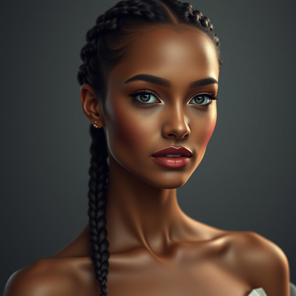 RAW photo, portrait of an elegant woman, hyperdetailed photography, gentle illumination, head and shoulders portrait, 80mm, f22, popular on ArtStation and Pixiv, high definition, precise focus, aesthetic, 8k UHD, DSLR, intricate details, soft lighting, superior quality, hair styled in braids, text, close up, cropped, captured out of frame, excellent quality, absence of low quality, no jpeg artifacts, unattractive, duplicate, lifeless, disfigured, normal fingers, well-drawn hands, well-drawn face, natural features, proportionate anatomy, correct proportions, normal limbs, unique face, balanced proportions, natural limbs, complete arms, complete legs, two arms, two legs, distinct fingers, appropriate number of fingers, graceful neck.