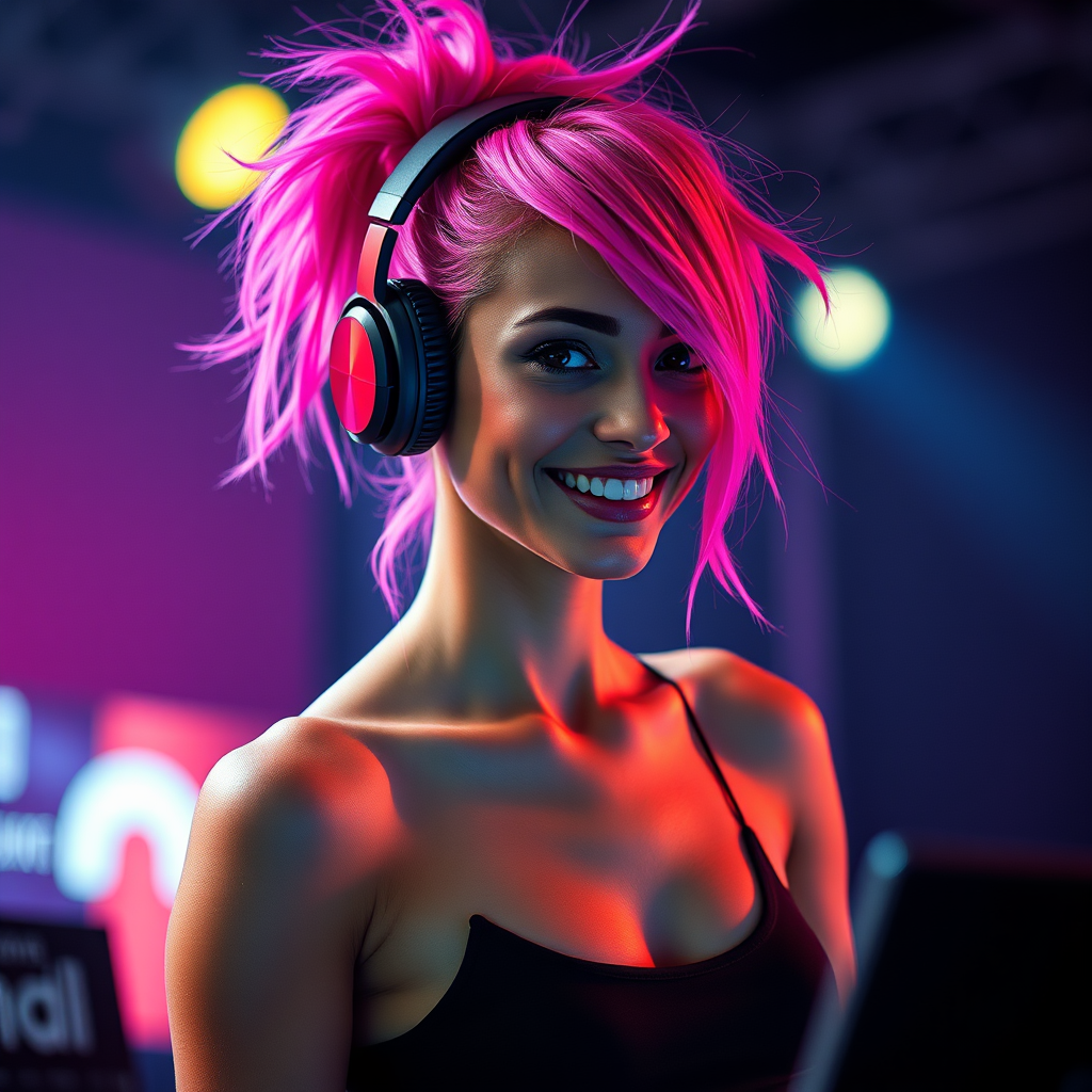 RAW photograph of a 24-year-old female DJ, slender build, bright pink hair styled in a messy ponytail weave, wearing detailed headphones, with a medium smile. She stands confidently on a stage, captured in 8k clarity with realistic, cinematic lighting. The image features high resolution, professional color grading, and a touch of film grain for authenticity. Background elements are subtly blurred to keep focus on the DJ, enhancing the mood and atmosphere of a live performance. The composition evokes a sense of dynamic energy and artistic expression within a vibrant setting.