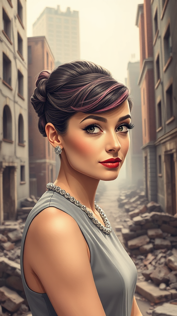 RAW photograph of Audrey Hepburn amidst city ruins, captured in 8k UHD with a DSLR, featuring soft, high-quality lighting and subtle film grain, reminiscent of Fujifilm XT3 illustration. The scene blends elements of 3D art, sepia tones, and painterly aesthetics, while incorporating cartoonish sketches. The image showcases low resolution and playful imperfections like quirky anatomy and extra eyebrows, paired with Audrey's unexpected pink hair and unique makeup choices. The overall atmosphere is an analog photo with a touch of whimsical creativity.