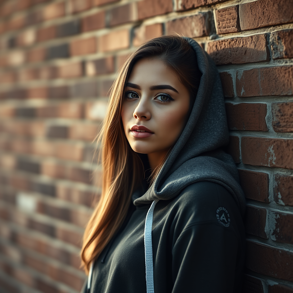 RAW photograph, stunning young woman wearing a hoodie beside a textured brick wall, softly lit and hyperdetailed, capturing the essence of candid elegance. Trending across art platforms, this shot boasts ultra-high detail and sharp focus, with a keen aesthetic eye. Shot in 8k UHD using a high-end DSLR, it features intricate details, soft ambient lighting, and high-quality composition.
