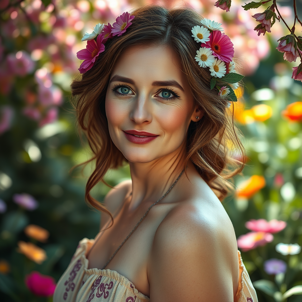 RAW portrait of a 40-year-old woman with a relaxed figure, adorned with flowers in her hair, set against an enchanting garden backdrop. Inspired by Anna Dittmann, this image is crafted with fantasy art elements, capturing the subject in a Dutch angle. The photograph, taken with a Cinestill Hasselblad 85mm lens with tilt-shift, features soft, photorealistic lighting. It boasts hyperrealistic and hyper-detailed qualities, showcasing intricate details such as the texture of skin and the interplay of light. This masterpiece captures the golden ratio, offering high detail and an ultra-realistic feel. The photo exhibits matte skin with subtle subsurface scattering and is reminiscent of studio photography. It's free of any visual distractions such as glasses, text, or low resolution, ensuring the highest quality visual experience.