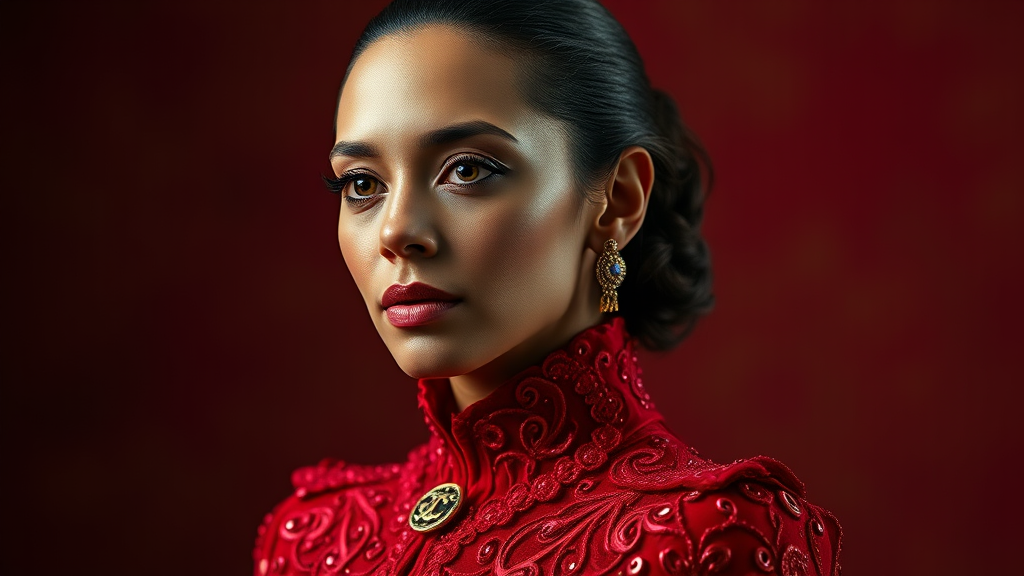 RAW portrait of a resilient woman wearing an ornate red dress designed by Karl Lagerfeld for House of Chanel. Captured at a dutch angle with a Cinestill Hasselblad 50 mm lens, showcasing intricate details, realistic skin textures, and a hyperdetailed finish in 8k resolution. The studio lighting highlights her features with a loop lighting technique, emphasizing the golden ratio in composition. The photograph exhibits a photorealistic and hyperrealistic quality, capturing every pore and matte texture on her skin. It's a true masterpiece of studio photography with high detail, ensuring a captivating and timeless portrait.