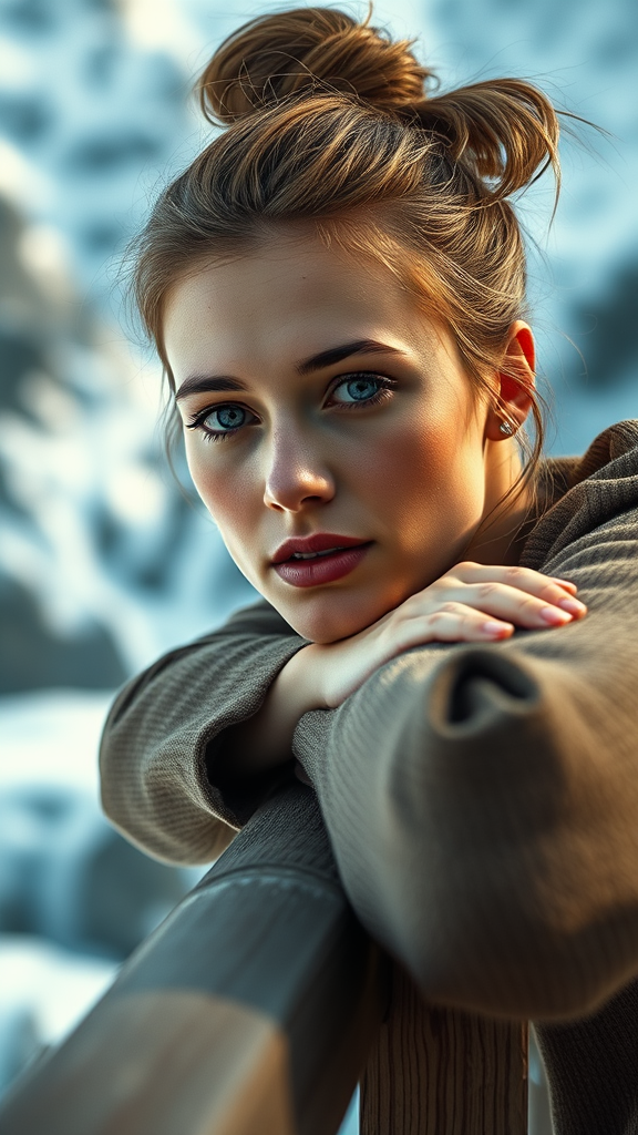 RAW portrait of a stunning 24-year-old German woman, leaning on a wooden railing with a messy bun, snowy mountains in the background. Her face is detailed with natural skin and light freckles. Captured in 8k resolution with extreme clarity and realism, the scene features cinematic lighting and professional color grading with a touch of film grain for texture. Her serene expression and relaxed posture convey tranquility, while the natural beauty of the environment enhances the portrait's overall harmony.