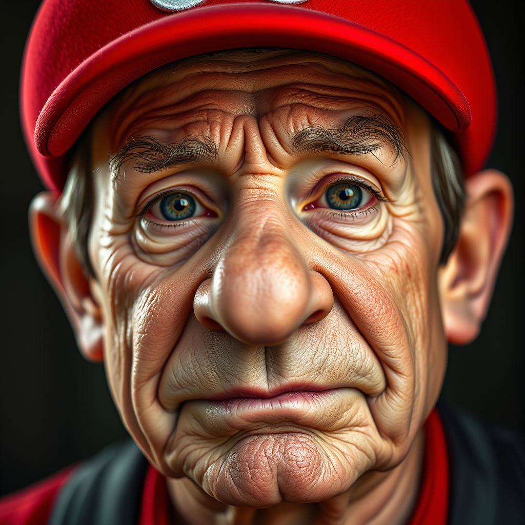 RAW portrait of an aged Super Mario, featuring intricate textures and a weary expression, highlighting prominent skin pores. He wears a classic red Super Mario cap, under ideal lighting conditions to achieve photorealism with sharp focus. Captured in an 8K UHD format using a Sony Alpha 1, 85mm lens, set to f/1.4 aperture, 1/500 shutter speed, ISO 100, with a palette of neutral and muted colors. The image avoids negative artifacts, ensuring a coherent and captivating representation.