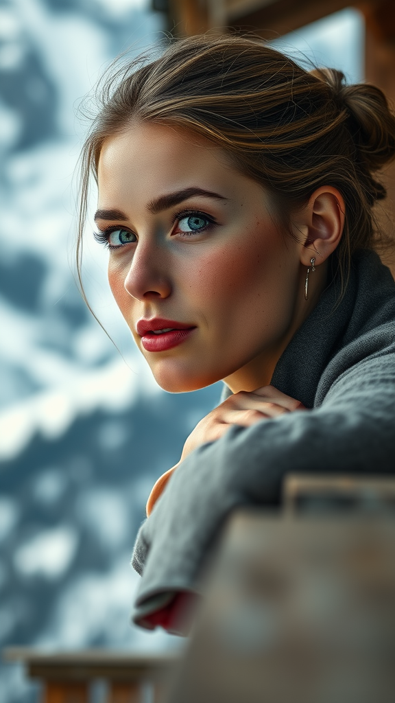 RAW portrait, stunning German woman, 24 years old, leaning on wooden railing, hair in a loose bun, surrounded by snowy mountains in the background, highly detailed face with natural skin and freckles, captured in 8k resolution for ultimate clarity and realism, featuring cinematic lighting and professional color grading with subtle film grain effects, emphasizing the serene beauty of the setting. Avoiding any distortions in anatomy or proportions, the image maintains a tasteful and artistic approach.